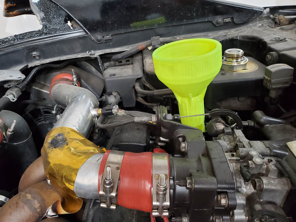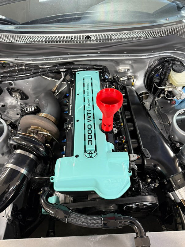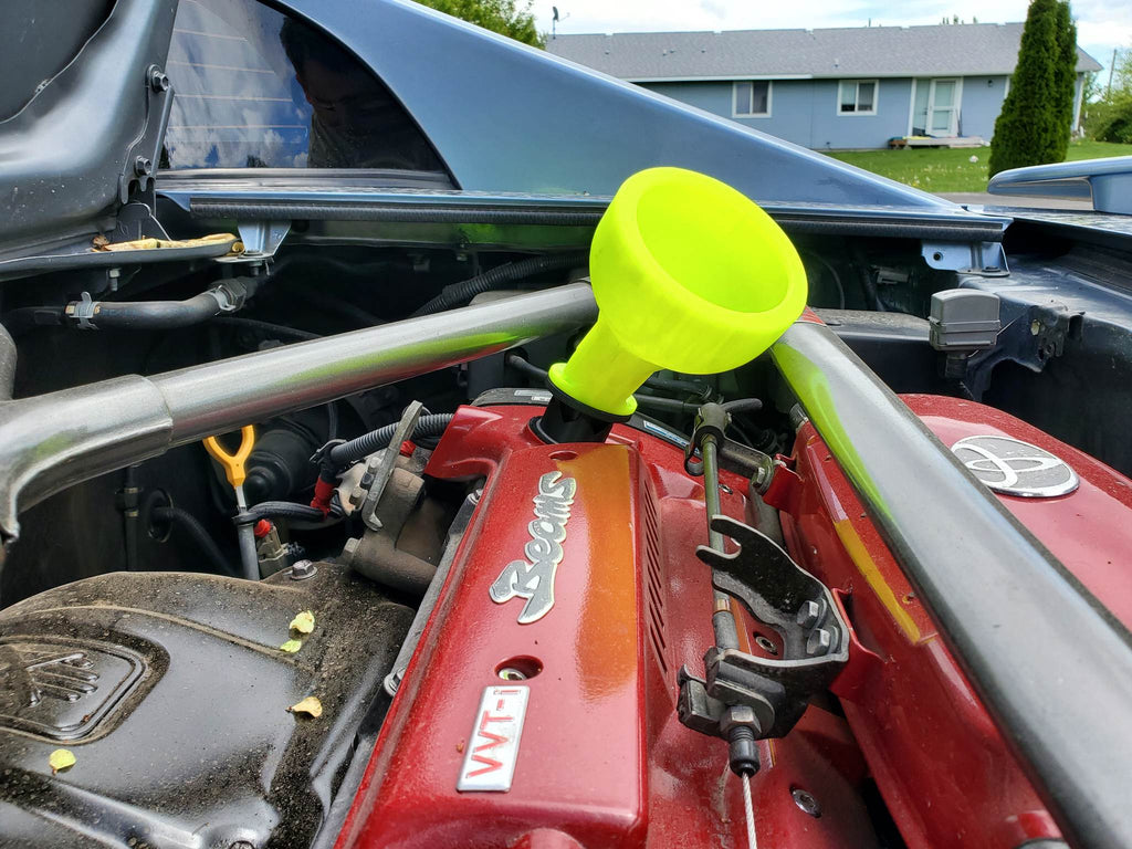 Note #2: There is now an option for the Toyota MR2/MR-S. We have tried our best to evaluate the funnel in every motor combination (Beams, 3SGTE, 2GR). The funnel is fully compatible with all of them with the exception of the SW20 with a TRD Strut Brace. It is NOT compatible. (strut bar will need to be removed during oil changes)